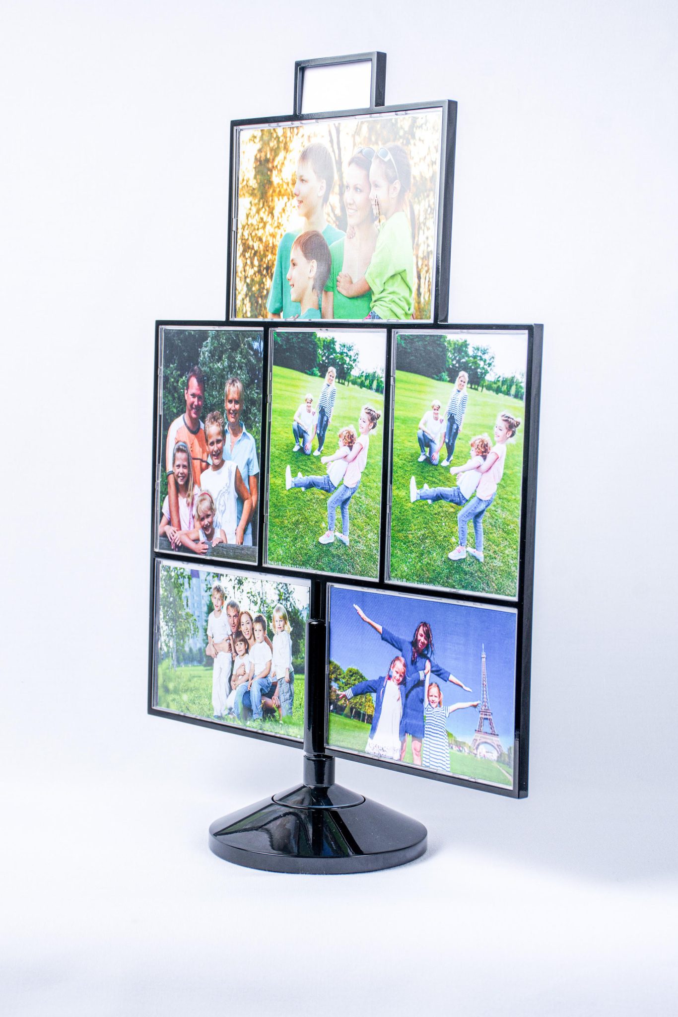 Innovative rotatable photo album with powered display. Features dual power options for continuous operation. Perfect for showcasing memories with 360-degree viewing capability.